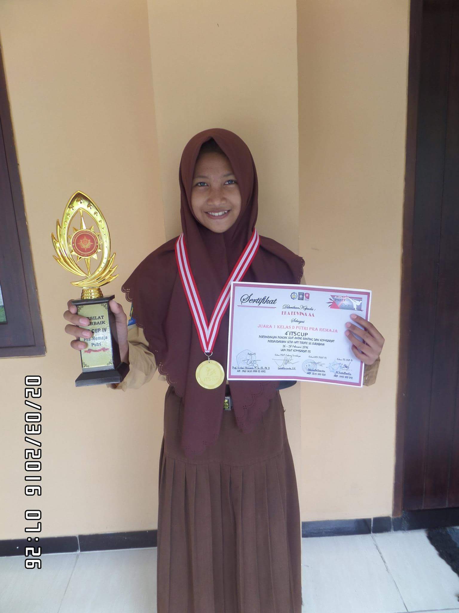 Selamat dan Sukses untuk Eka Ervina A kelas 7C SMP Wijaya Putra Surabaya telah Mendapatakan prestasi JUARA 1 dan PESILAT TERBAIK dalam pertandingan pencak silat Pra remaja putri se Kota Surabaya yang di adakan oleh ITS.
